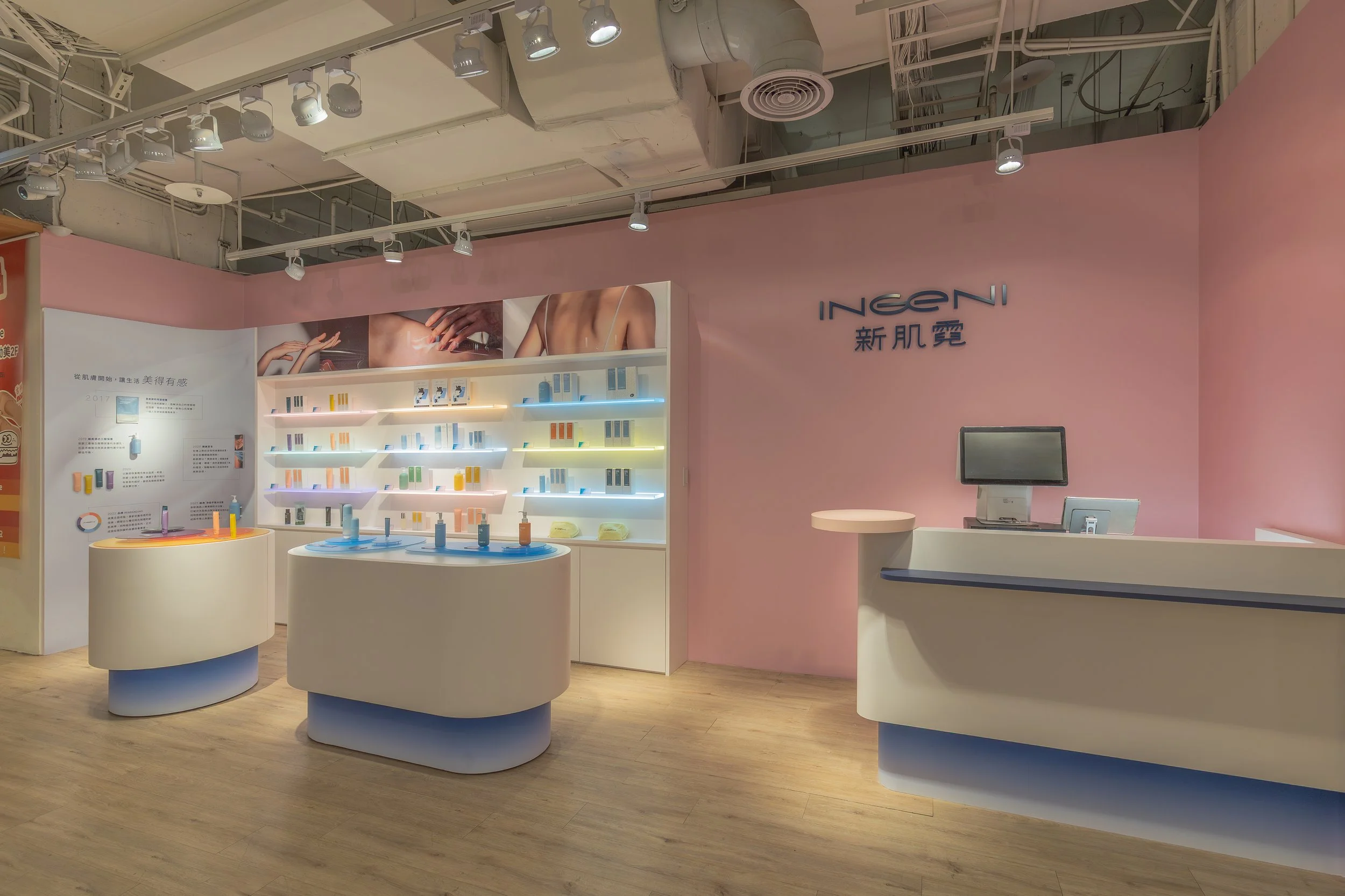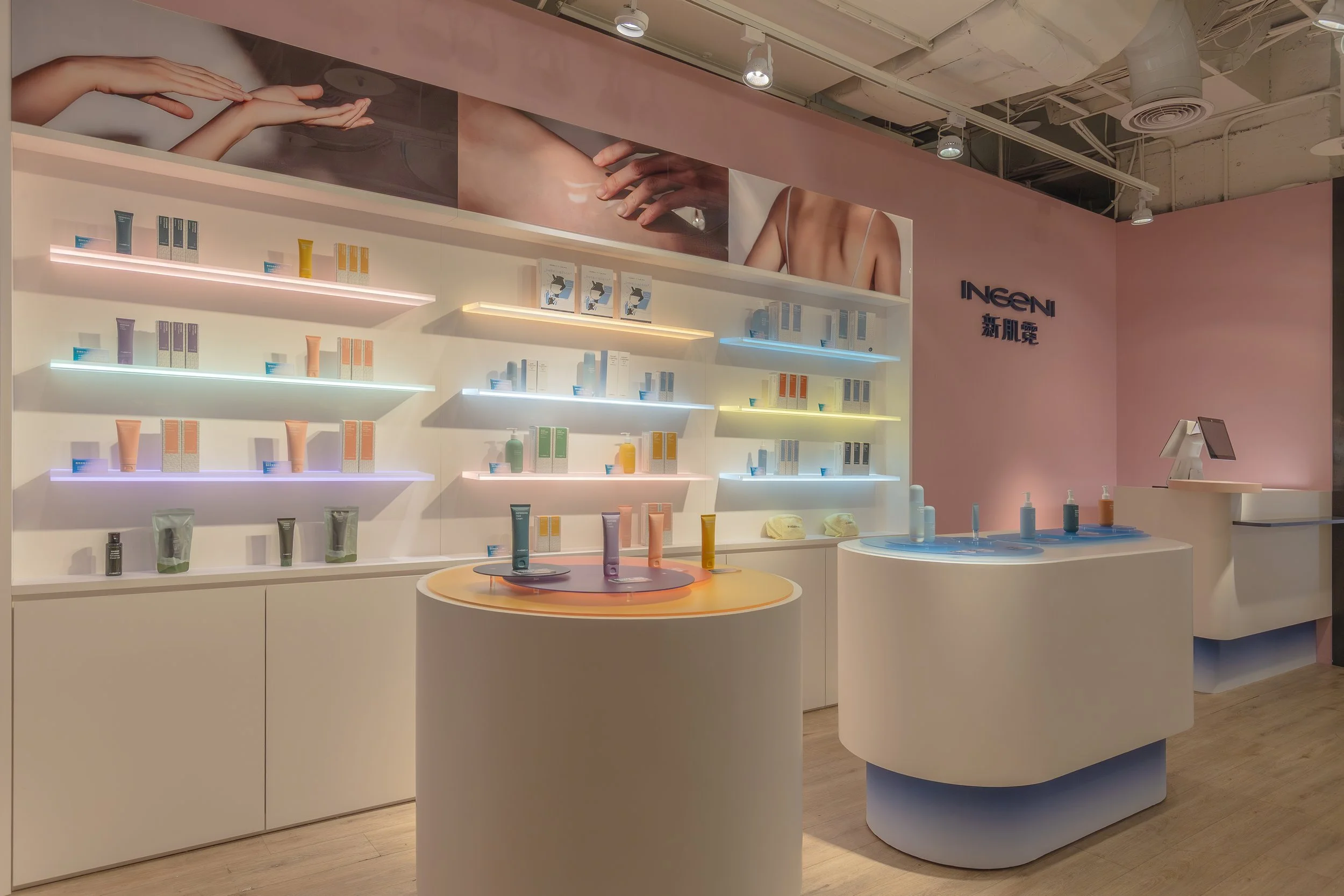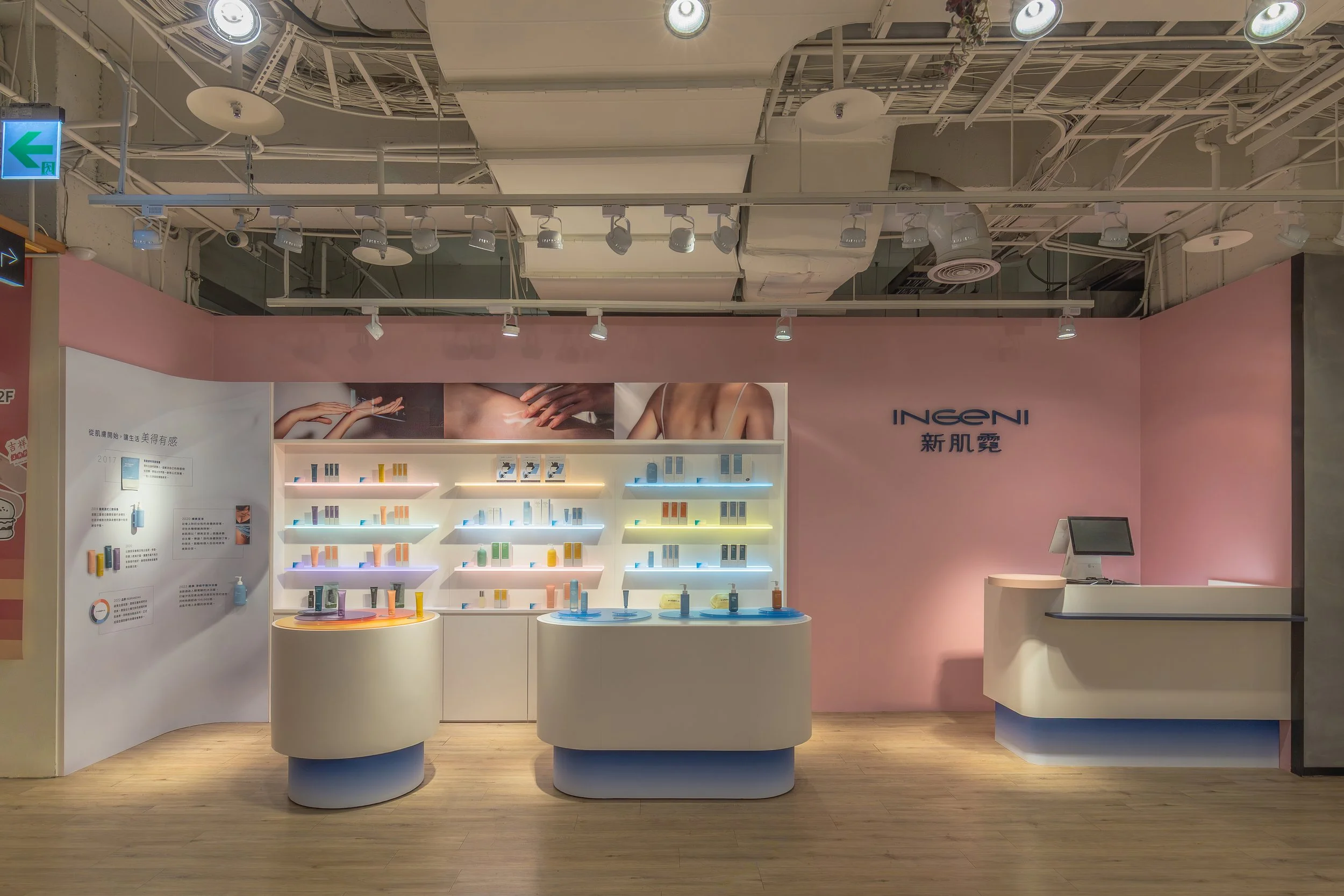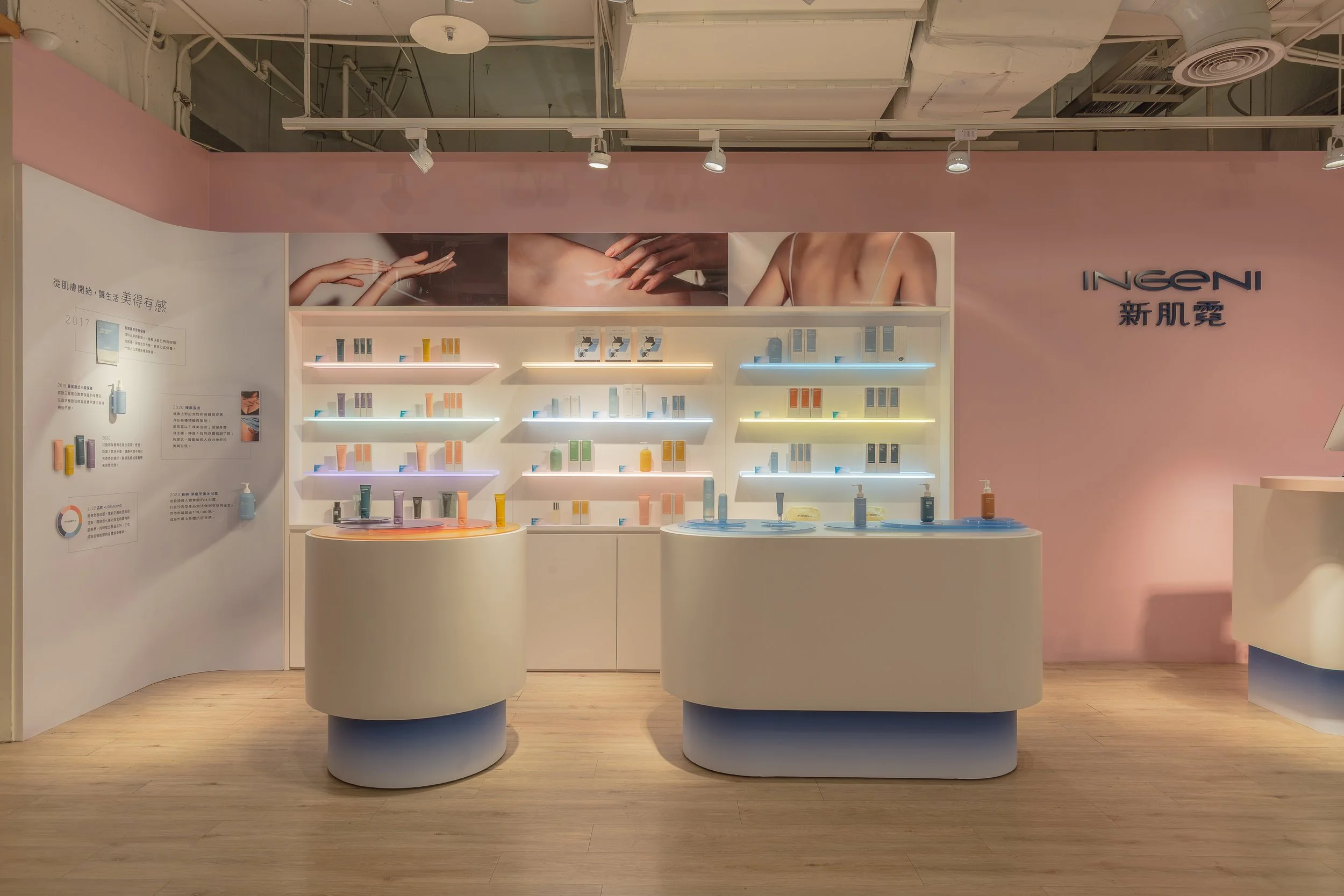位於台北市誠品信義的首間 新肌霓 INGENI 專櫃,延續了一貫的柔美品牌風格與清新形象,運用圓潤的線條造型,搭上柔和的自然色溫光源,打造有如島嶼般層層堆疊的中島設計,同時規劃一對一的產品試用櫃檯,讓商品的購物經驗更加完整且親切,有別於以往僅能透過線上購物的虛擬體驗。