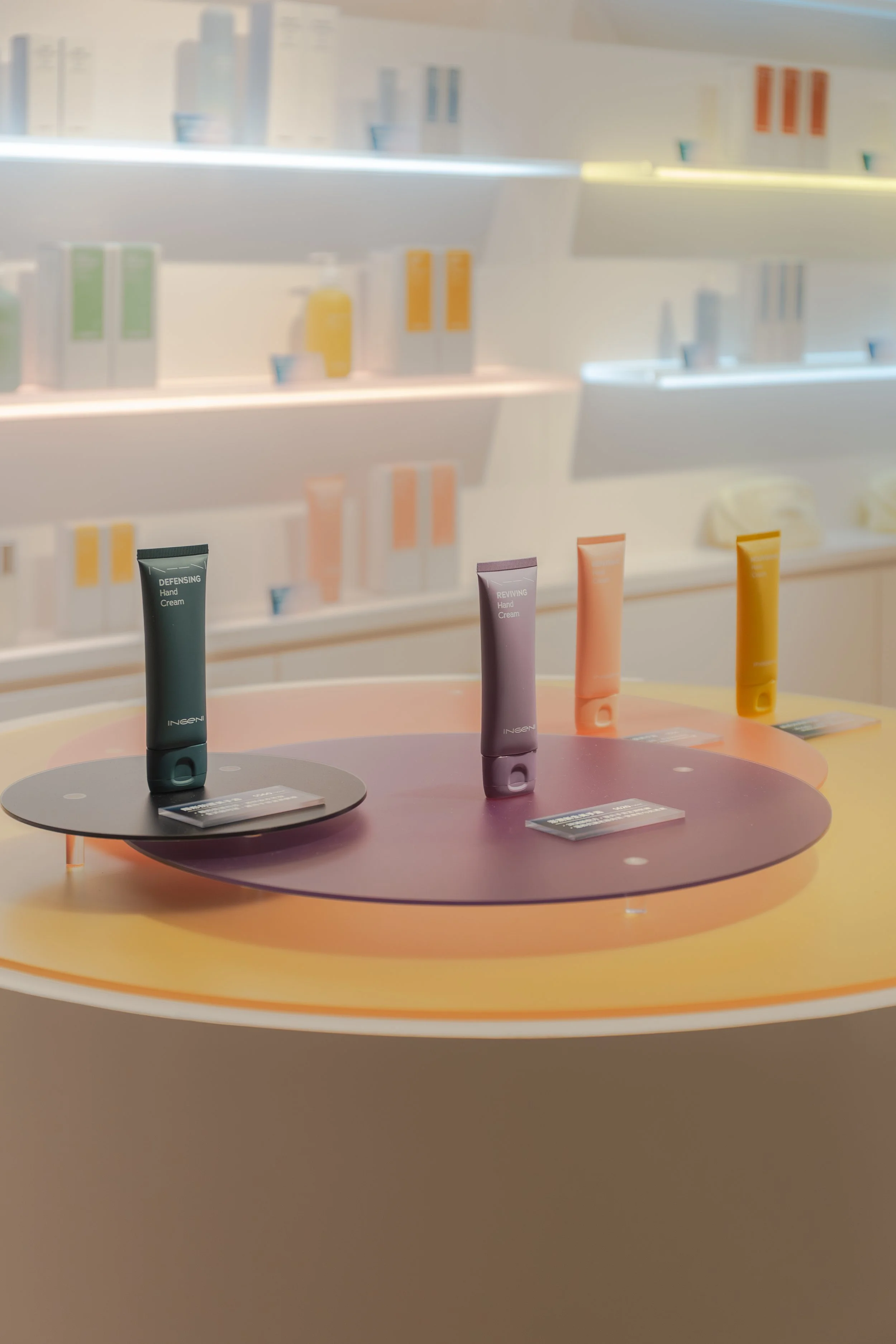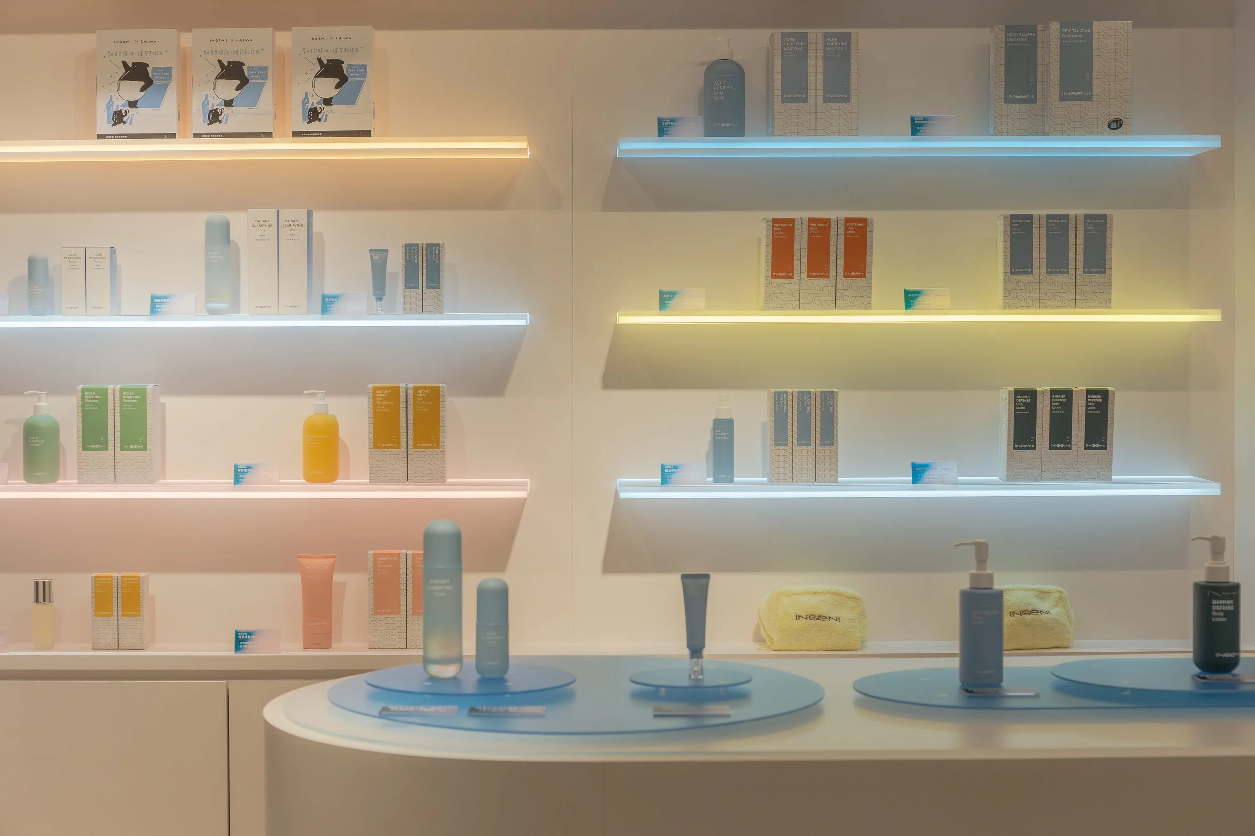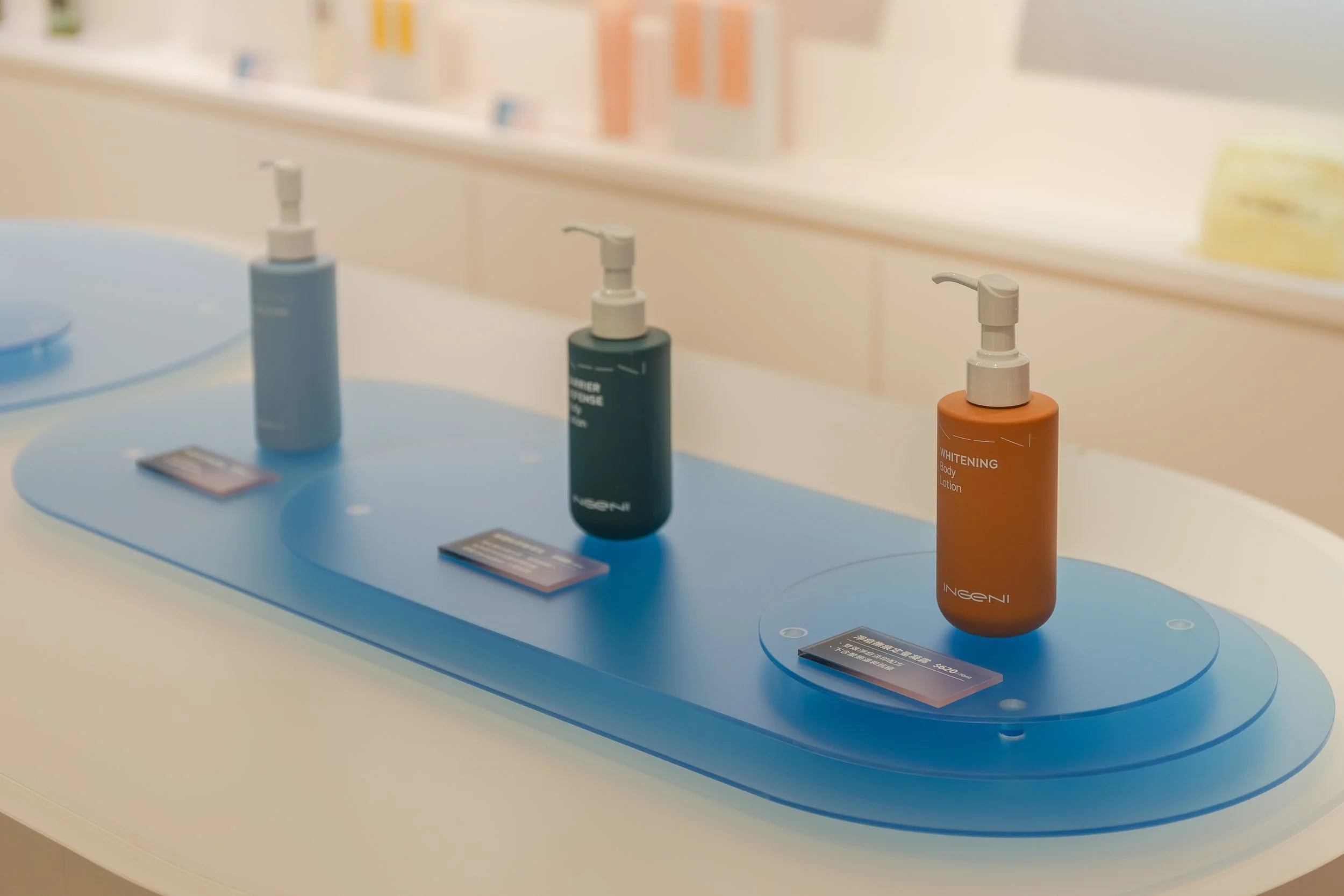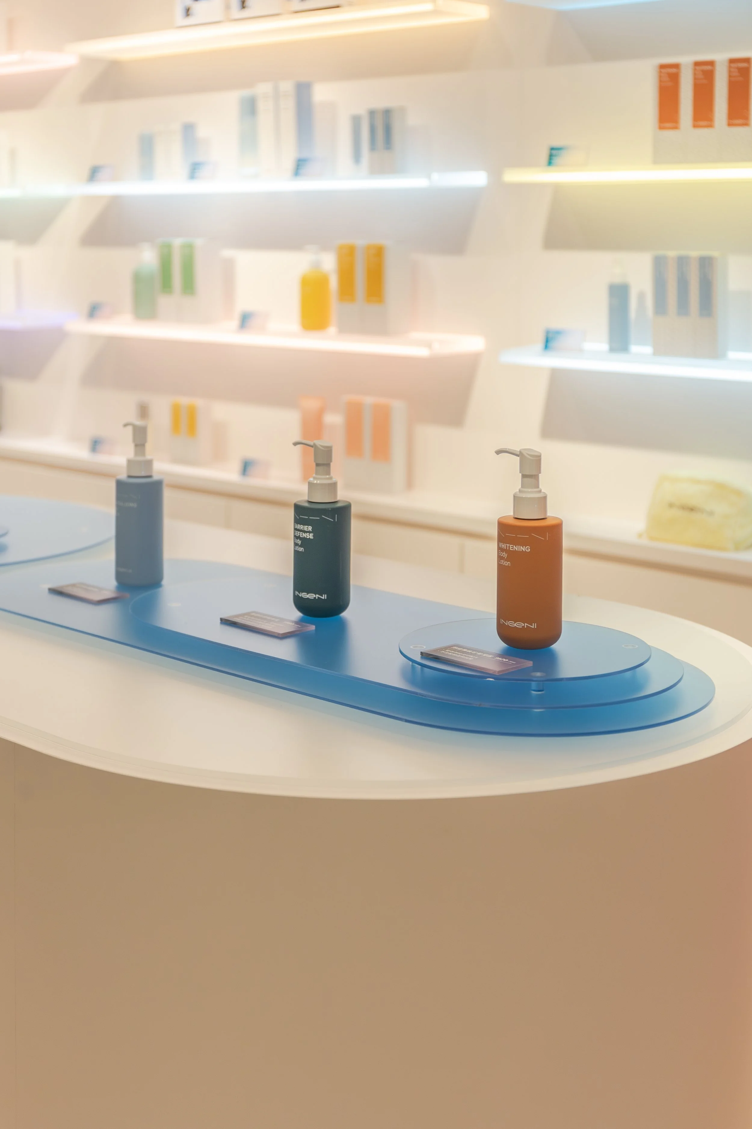 位於台北市誠品信義的首間 新肌霓 INGENI 專櫃,延續了一貫的柔美品牌風格與清新形象,運用圓潤的線條造型,搭上柔和的自然色溫光源,打造有如島嶼般層層堆疊的中島設計,同時規劃一對一的產品試用櫃檯,讓商品的購物經驗更加完整且親切,有別於以往僅能透過線上購物的虛擬體驗。