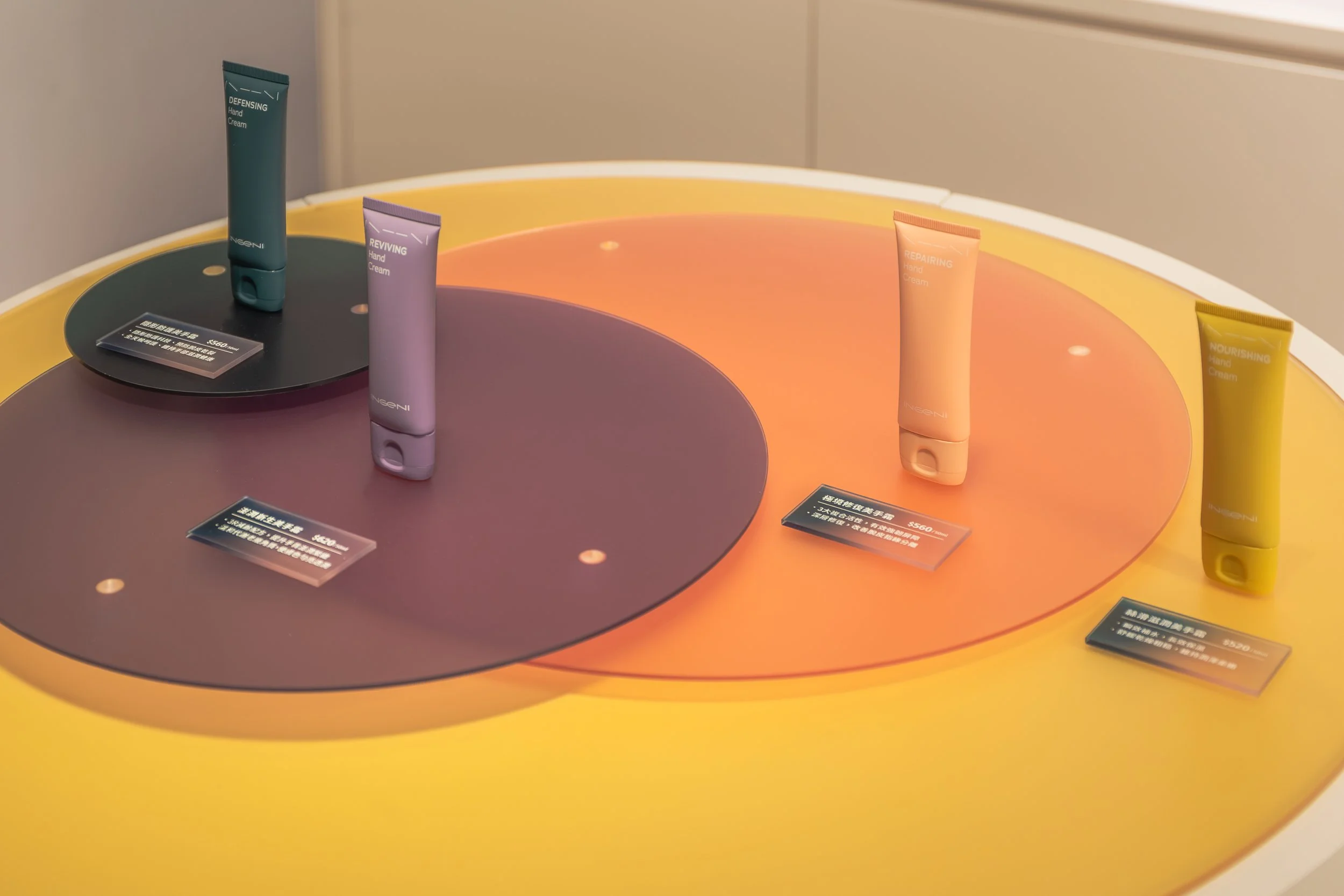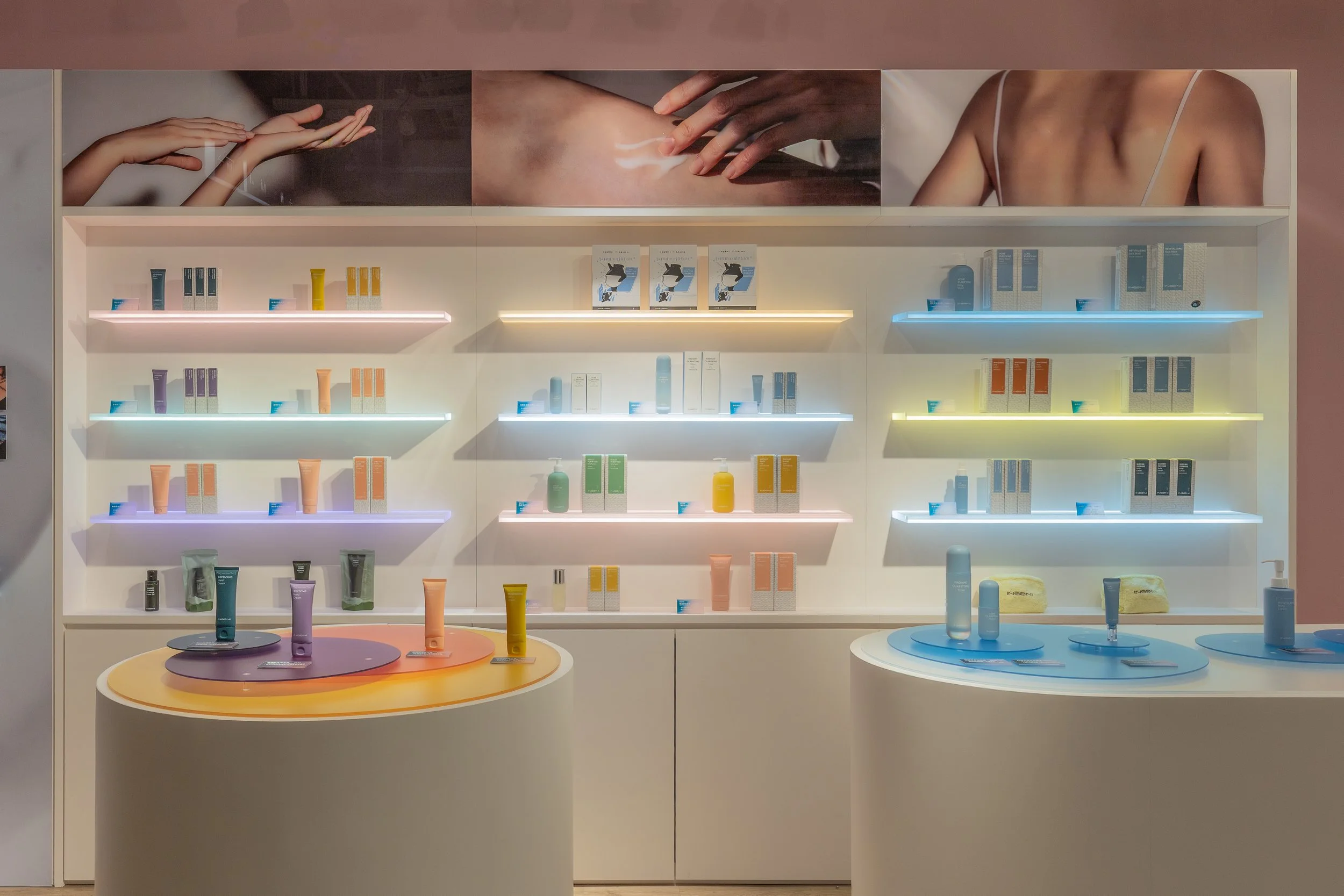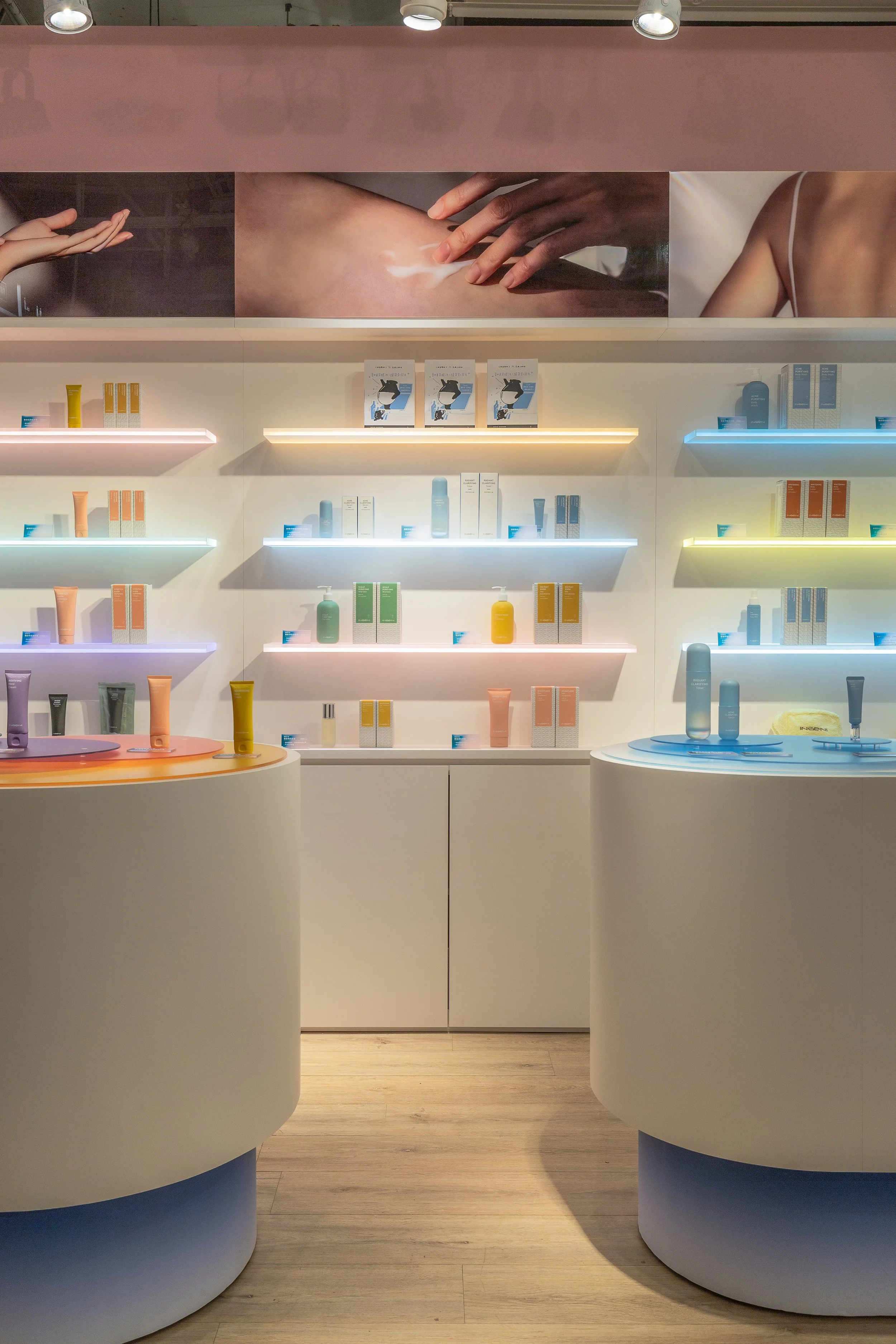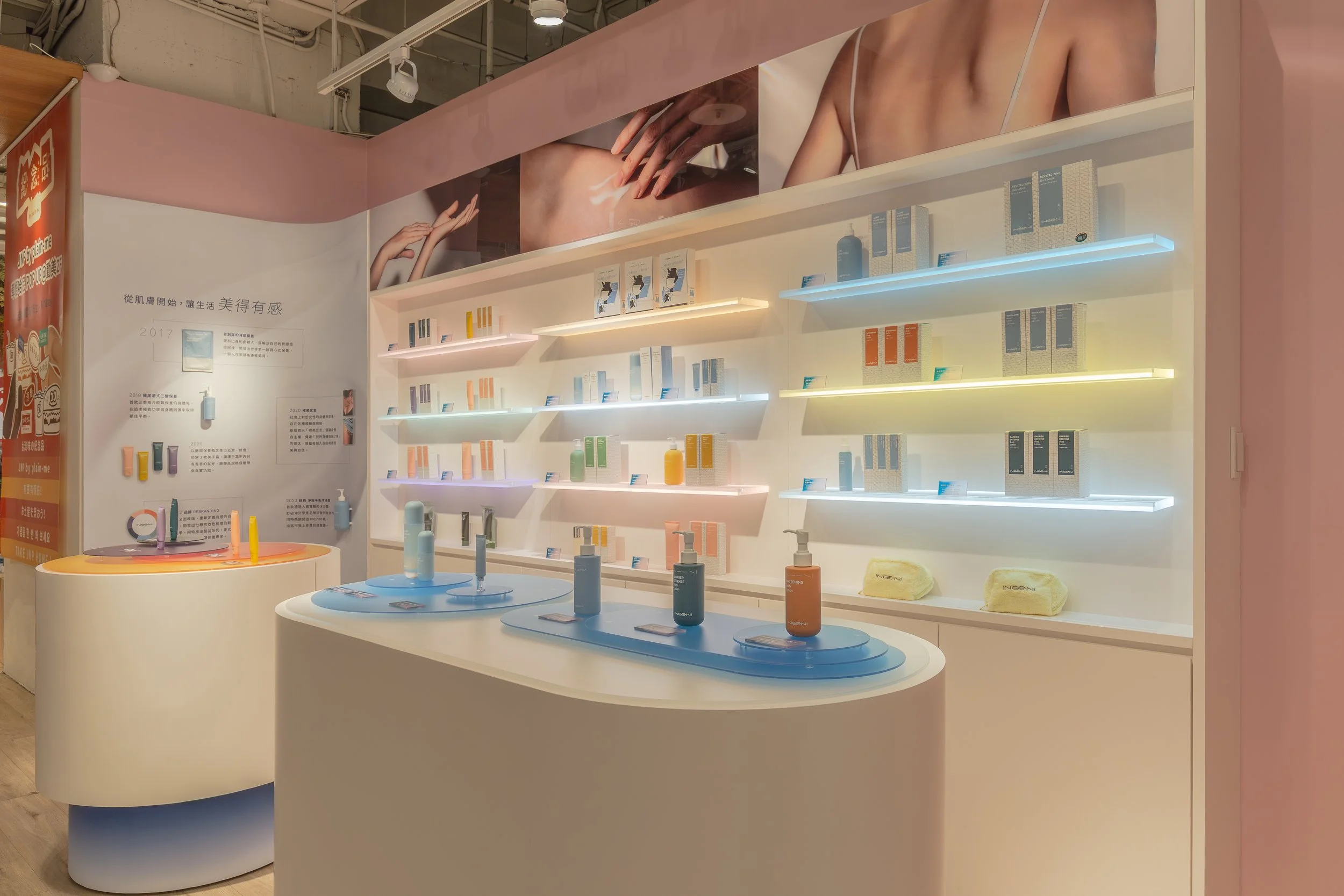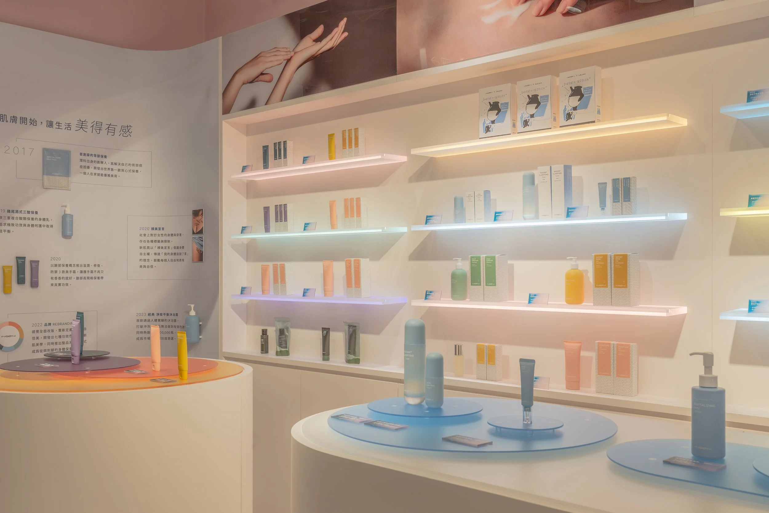 以品牌所定義出的膚況七面向,各自代表的七種色彩為設計發想主軸,利用霧面壓克力透出色彩光源並以漸層的手法,將各種色彩進行拆解及堆疊,光影透過半透明材質介面,讓產品不只是陳列,而是被色彩氛圍襯托強化視覺辨識度,圓弧展示檯與收銀櫃以一致曲線語彙,使空間兼具品牌科學理性與感性溫度的平衡。