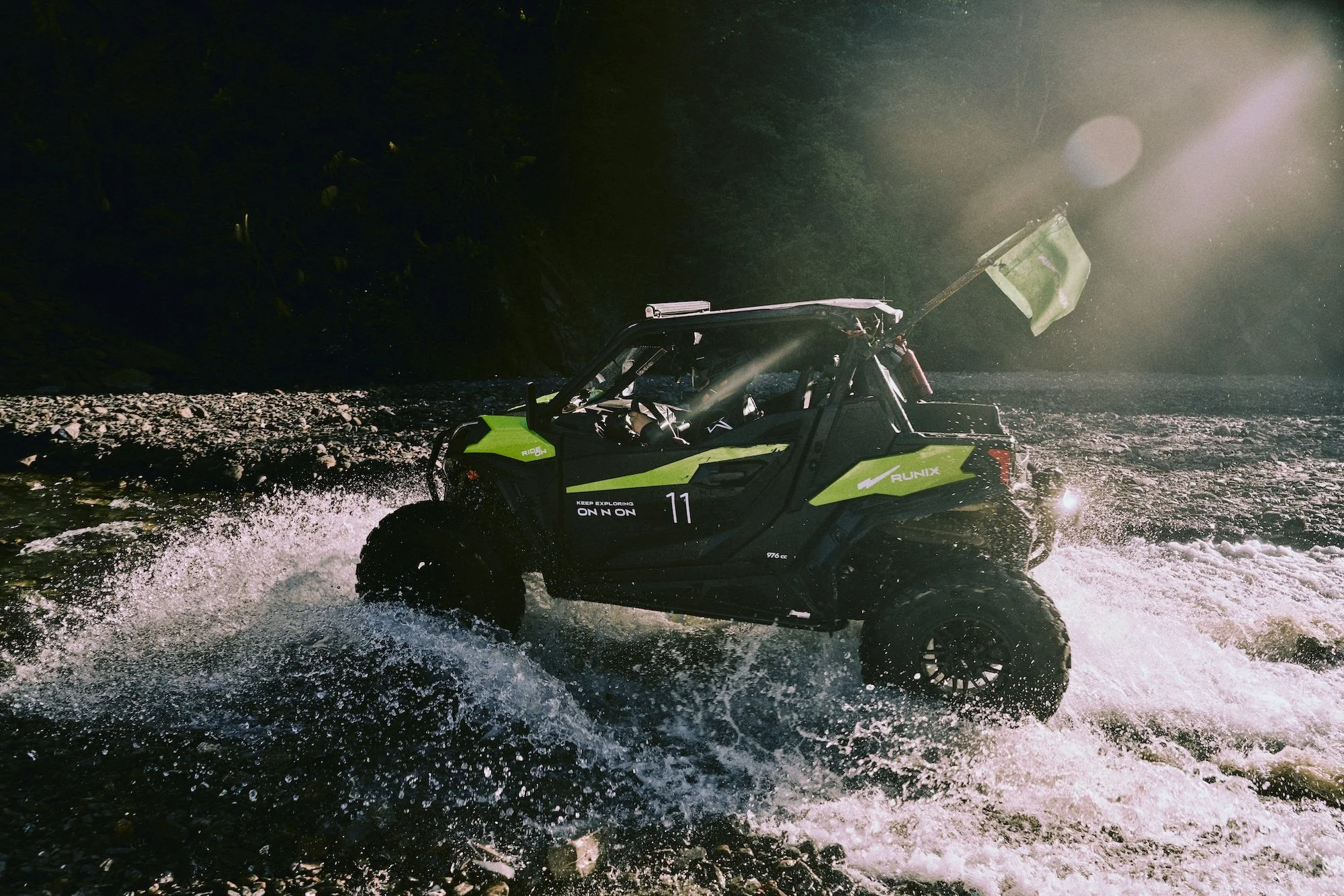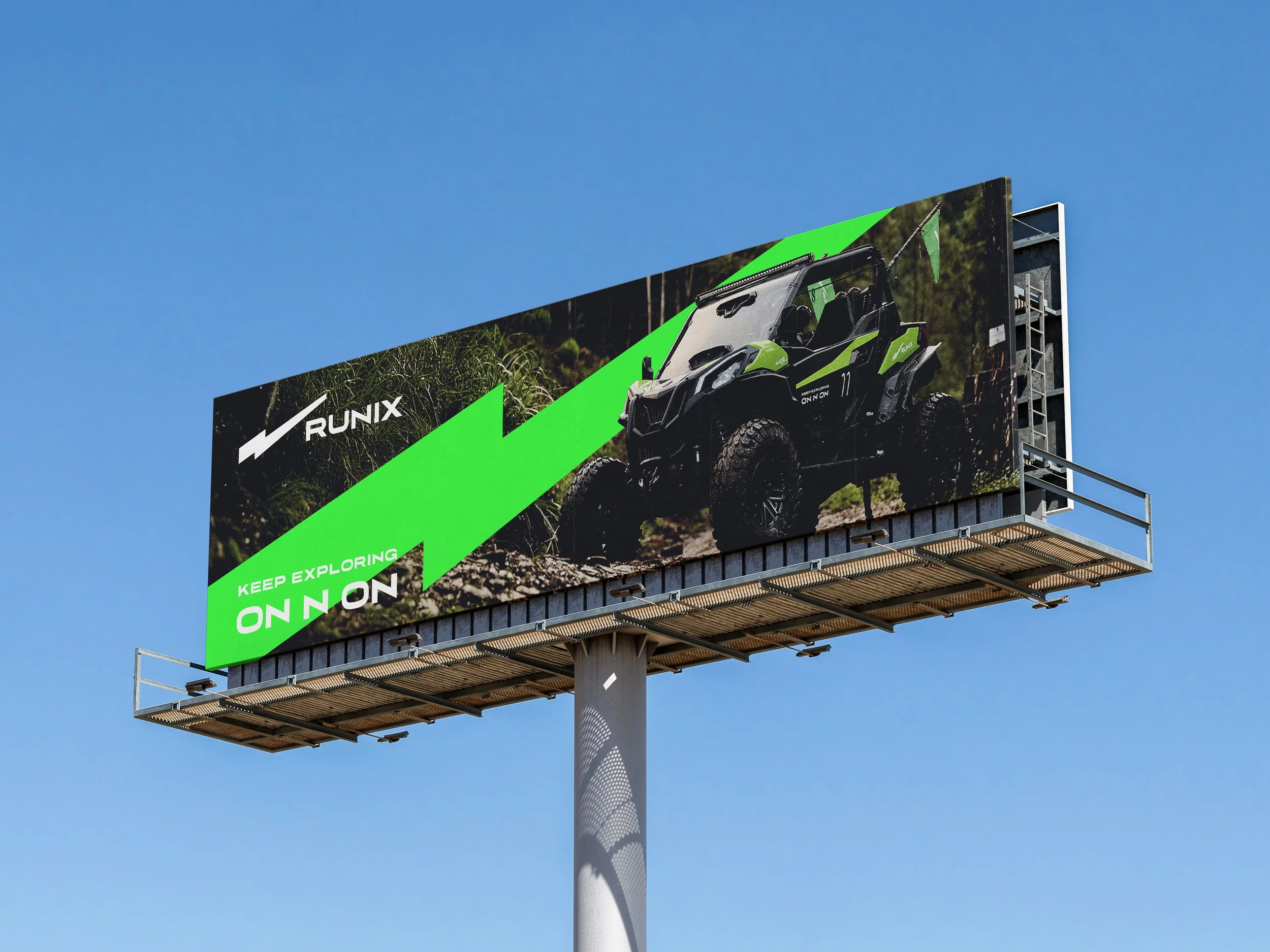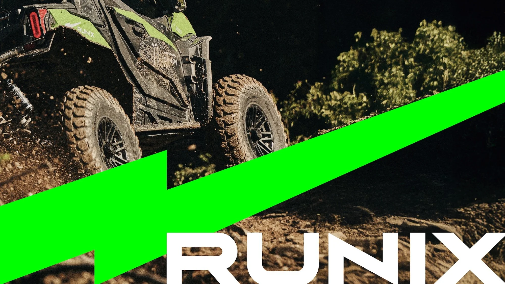 我們為 RUNIX 打造專屬形象車款,作為產品性能展示與品牌宣傳影片的核心載體。這台 ATV 不僅是展示工具,更是 RUNIX 精神的具象化呈現。車身設計大量運用品牌識別中的動態幾何語彙,透過俐落線條與速度感構圖,完整延伸品牌主視覺系統,展現充滿能量、無畏挑戰、勇於探索的品牌性格。形象車在高速移動與極限場景中,成為性能實力與品牌態度的最佳代言者,象徵 RUNIX 持續突破、ON N ON 前行的核心精神。