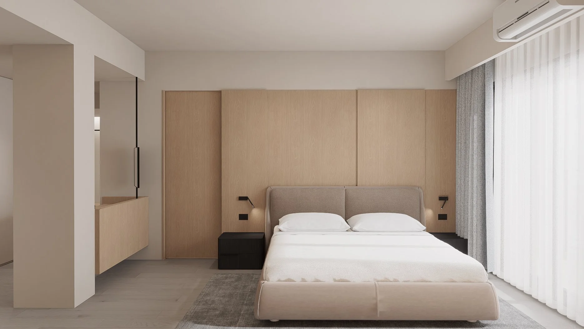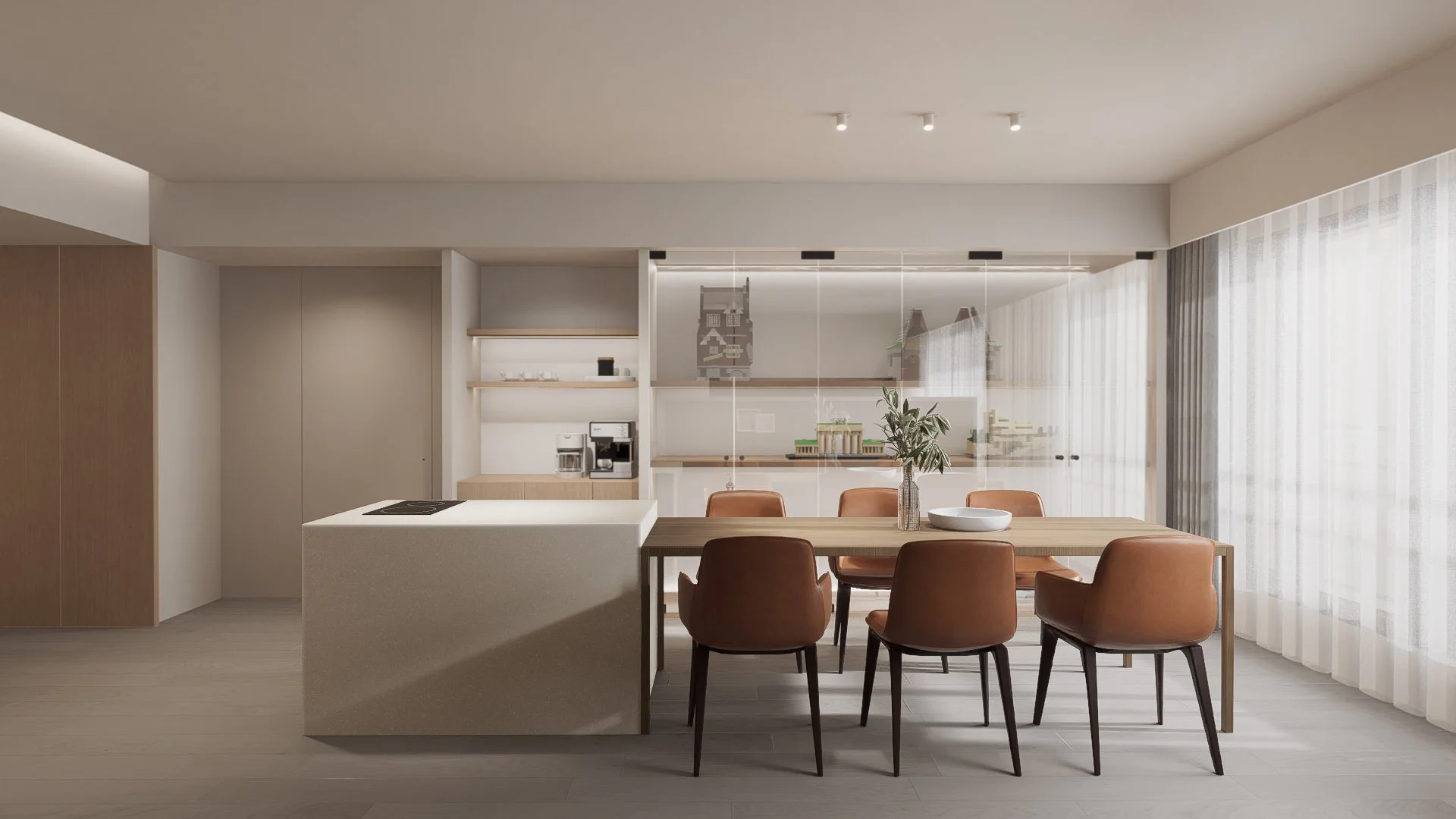 整體空間以裸杏色牆面與橡木原色作為核心語彙,色調溫潤協調,質地對比卻不衝突,在自然光照下層層遞進,形塑細膩豐富的空間表情。材質的斷點與接續,強化了空間延展與視覺韻律,於細節中形成自然的秩序。