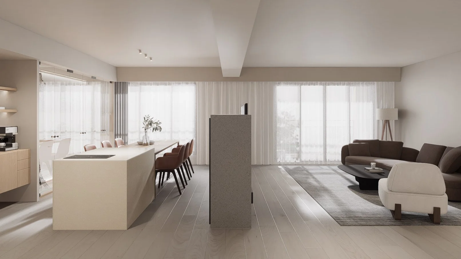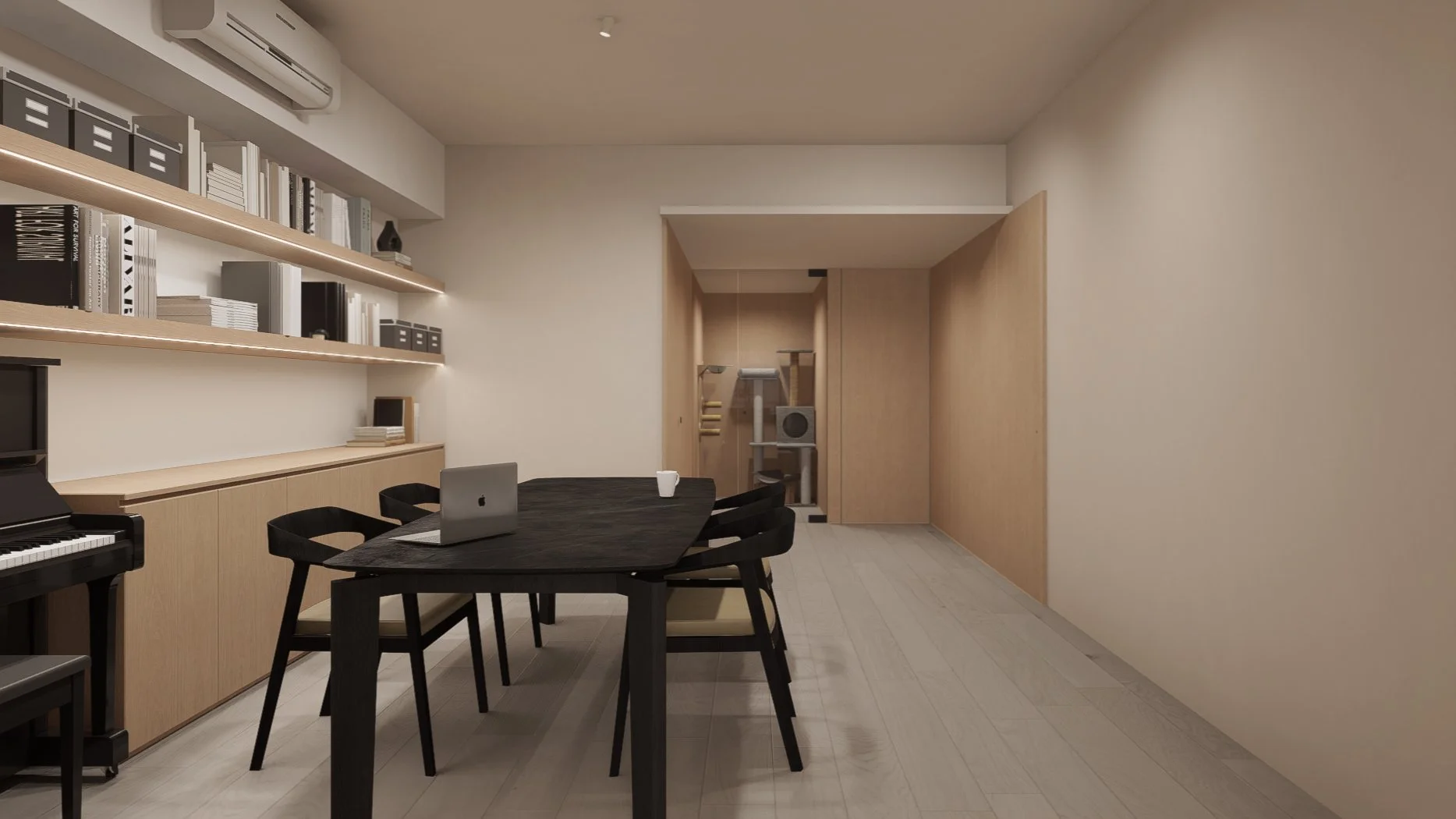 「緩」是一種節奏、一種生活的步調,也象徵空間中有機的流動與自然轉折;「境」是空間場域,也是一種心境。 設計以一道 L 型的動線與視覺序列,串連起空間的流動與材質的線性延伸,於轉折之間勾勒出公私領域的柔性界線。牆體開口與可調節的場域分界手法,使空間保有彈性與通透感,轉換之間創造出層次與留白,讓回家後的心境緩緩的於空間中逐漸沉澱,也讓視覺在開敞與收束之間取得平衡。