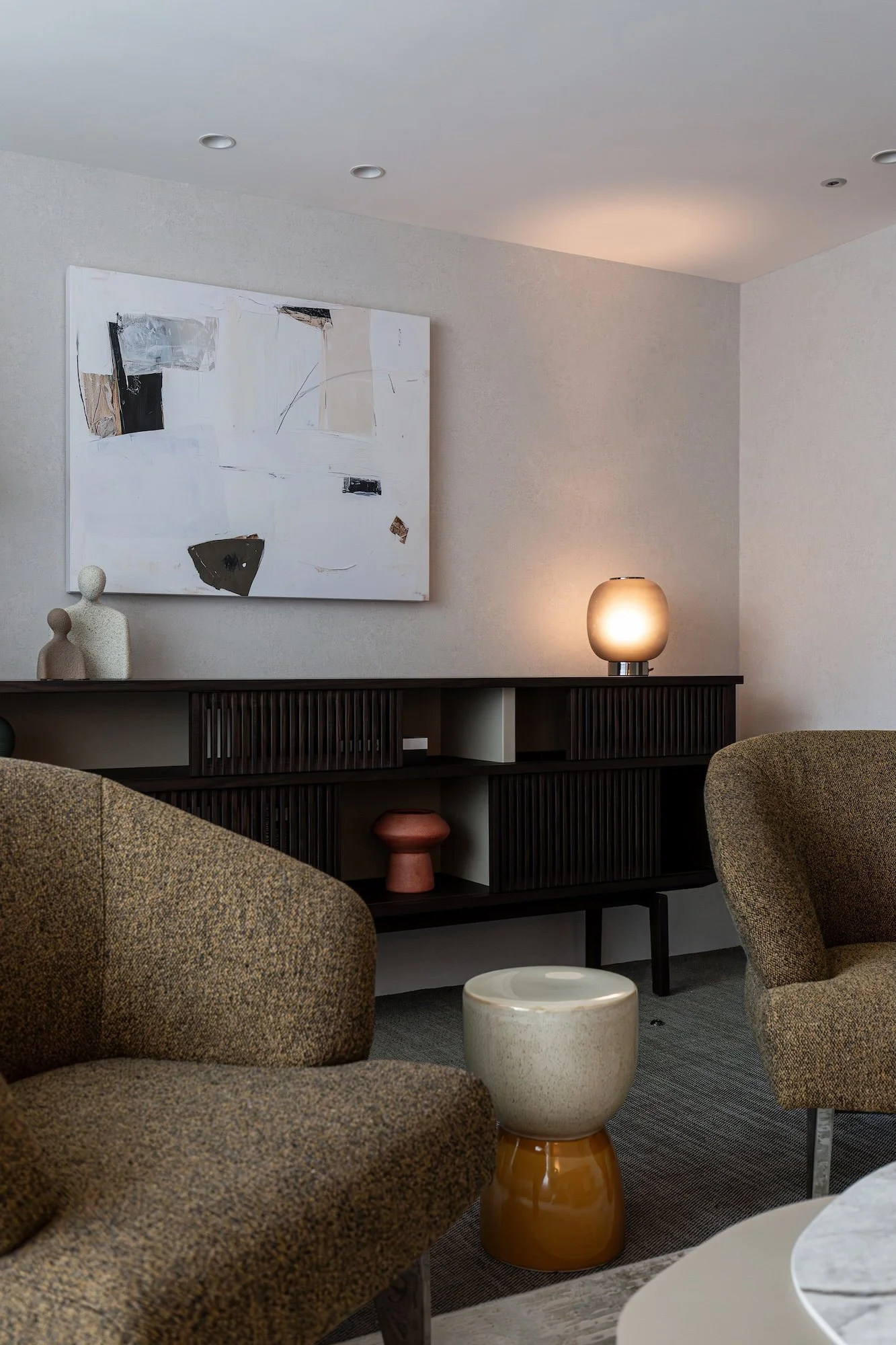 Within the private counseling rooms, the design language shifts toward warmth and softness. Expansive floor-to-ceiling windows introduce filtered natural light, which, paired with curved furniture and earth-toned textiles, creates a cocooning effect. This softens the neutral structure, establishing a safe and pressure-free environment for open dialogue.
