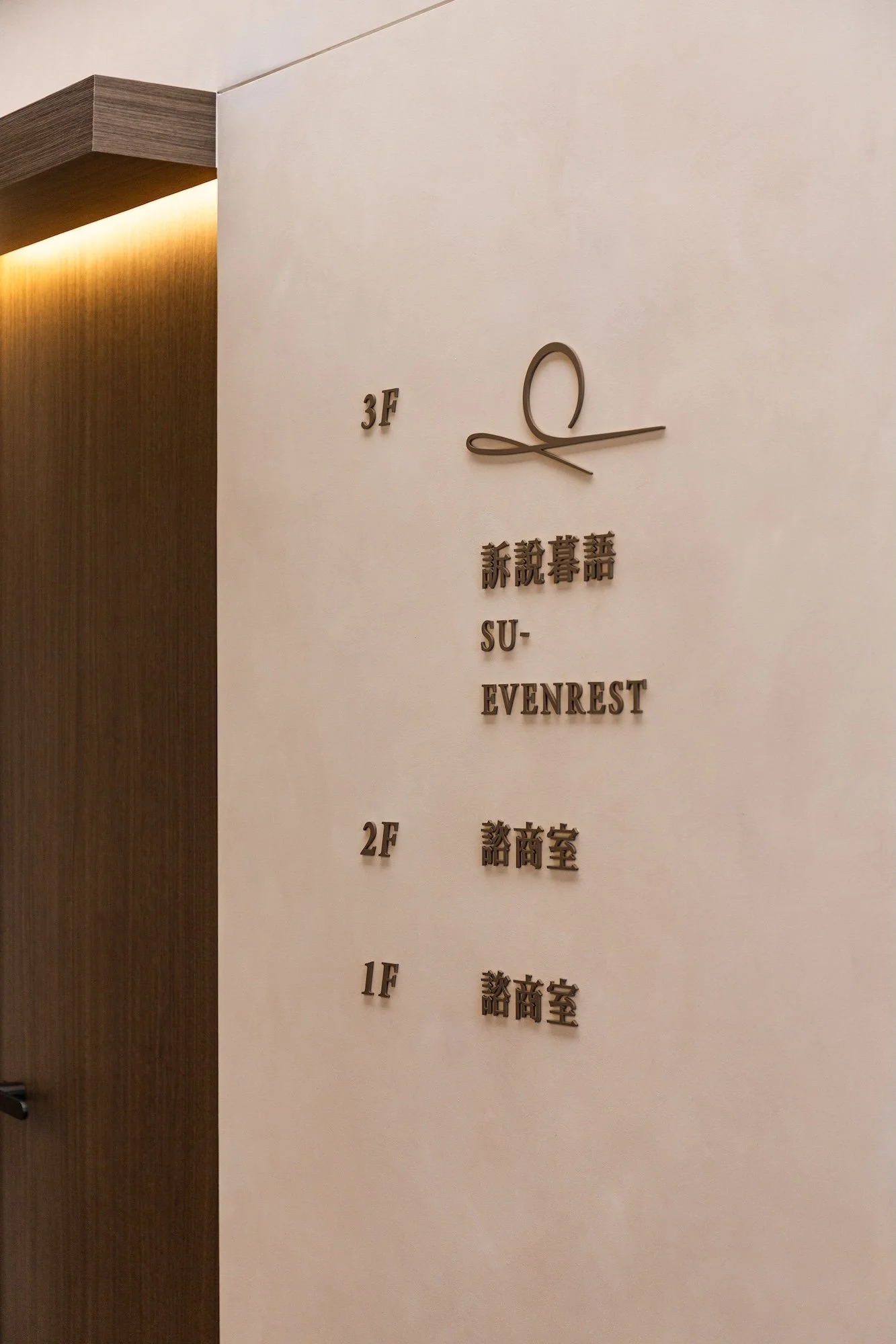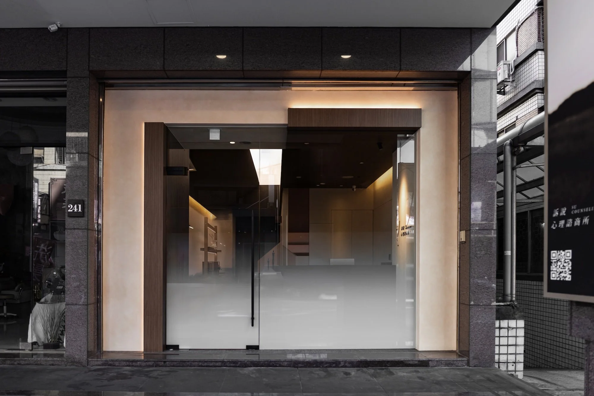 入口長廊利用挑高的建築優勢,以斜向的深色金屬塗料天花構築出具安定感的量體造型;上方長達 7.5 米的導光膜如同裂縫中灑下的天光,在視覺上產生強烈向內延伸的張力,也隱喻著為沉重的心靈尋得一處向上釋放的出口。材質運用上,透過手感塗料、深木色介面與金屬構件的厚薄對比,強化了立面的幾何層次;隱晦的燈光鋪陳於結構轉折處,精準勾勒出材質邊界。其中點綴的橘紅色系洞石,象徵著內在能量的覺醒,引導訪者完成一場關於自我察覺的深度體驗。